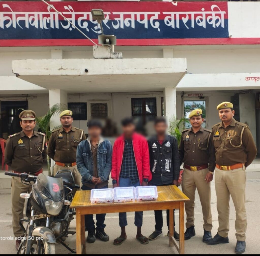 पुलिस अधीक्षक बाराबंकी श्री अर्पित विजयवर्गीय द्वारा जनपद में अपराध एवं अपराधियों पर अंकुश लगाने तथा जनपद में हुई चोरी की घटनाओं का शीघ्र अनावरण करने व अभियुक्तों की गिरफ्तारी हेतु समस्त थाना प्रभारियों को निर्देशित किया गया है। इसी क्रम में थाना जैदपर पुलिस द्वारा चोरी की 03 घटनाओं का सफल अनावरण कर तीन शातिर चोरों/अभियुक्तों 1. अमन उर्फ चमन पुत्र सर्वेश उर्फ लऊवा निवासी पल्हरी थाना सफदरगंज जनपद बाराबंकी, 2. शिवम रावत पुत्र साहबलाल उर्फ सहबू, 3.अर्जुन उर्फ पतरी पुत्र कमलेश निवासीगण ग्राम शाहपुर कडेरा थाना जैदपुर जनपद बाराबंकी को मो0 शाहपुर कटरा कब्रिस्तान के पास से गिरफ्तार किया गया। अभियुक्तगण के कब्जे से चोरी के सोने/चांदी के जेवरात, नकदी व घटना में प्रयुक्त एक अदद पल्सर मोटर साइकिल नं0- UP32GZ0370 बरामद की गयी।