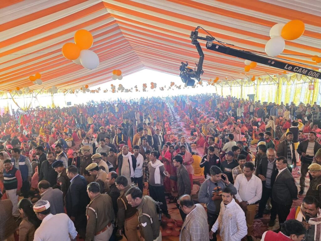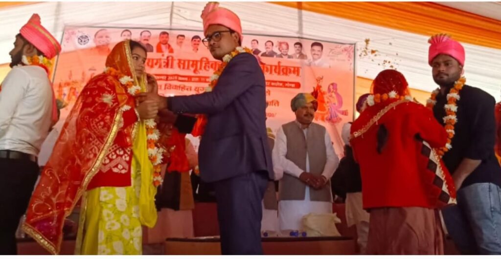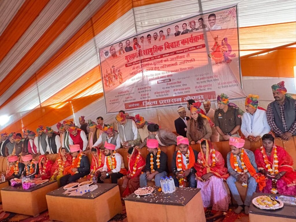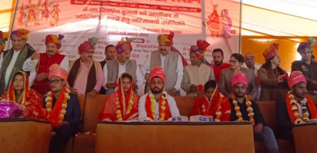 कार्यक्रम में जनपद के सभी ब्लॉकों व नगर पालिका परिषद/नगर पंचायतो को मिलाकर कुल 511 जोड़े पंजीकृत थे। इसमें से 395 जोड़ों का विवाह पूरी रीती रिवाज के साथ संपन्न कराया गया । इसमें 62 जोड़ों का इस्लामी पद्धति से निकाह कराया गया। कार्यक्रम के मुख्य अतिथि मंत्री कारागार उत्तर प्रदेश सरकार /जनपद के प्रभारी मंत्री दारा सिंह चौहान रहे । विधायक मनकापुर ,विधायक गौरा ,विधायक तरबगंज ,डीएम प्रियंका निरंजन,सीडीओ अंकिता जैन तथा सांसद गोंडा /केंद्रीय विदेश राज्यमंत्री प्रतिनिधि रमाशंकर मिश्र ने विवाह मंडप पर बैठे जोड़ों को आशीर्वाद देते हुए वैवाहिक जीवन की शुभकामनाएं दी। कार्यक्रम के दौरान मुख्य अतिथि ने कहा कि हमारी सरकार में किसी भी गरीब की बेटी के हाथ पीले होने से नहीं बचेंगे,वो चाहे किसी जाति व धर्म की हो। सामूहिक विवाह हेतु हमारी सरकार रु60000/-प्रति जोड़े के दंपतियों के खाते में दिया जाता है। शेष उपहार सामग्री दी जाती है। इसमें चांदी की पायल, बिछिया ,स्टील का डिनर सेट, 5 लीटर का प्रेशर कुकर, कन्या हेतु दो जोड़े कपड़े,वर हेतु एक जोड़ा कपड़ा। दीवाल घड़ी, सौंदर्य प्रशासन किट,आदि गृहस्थी का सामान सम्मिलित होता है। कार्यक्रम में उप जिलाधिकारी सदर गोंडा एके गुप्ता, नगर मजिस्ट्रेट पंकज वर्मा, जिला समाज कल्याण अधिकारी एसपी सिंह ,खंड विकास अधिकारी सहित अन्य सभी संबंधी अधिकारी उपस्थित रहे। एमडी न्यूज ब्यूरों गोंडा अजीत यादव
