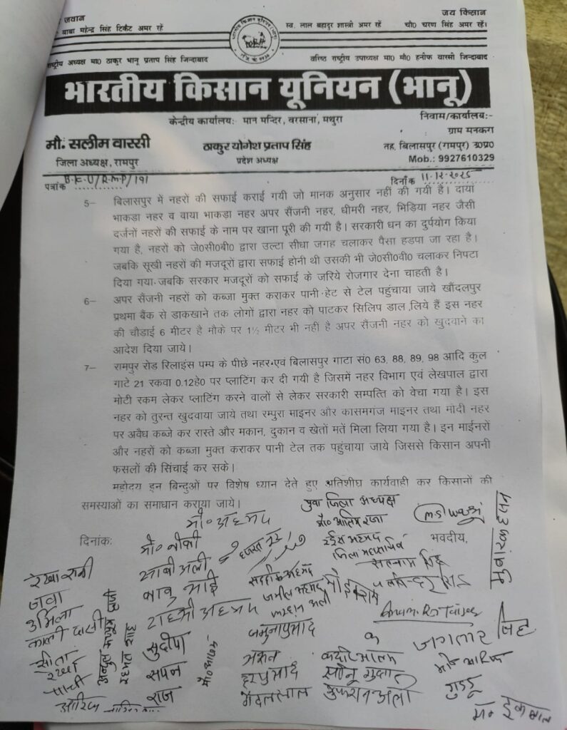 किसानों ने नहरों पर अवैध कब्जों का भी मुद्दा उठाया। प्रथमा बैंक से डाकघर तक नहर को पाटकर स्लैब डाल दिए गए हैं, जिसकी चौड़ाई 6 मीटर होनी चाहिए लेकिन मौके पर डेढ़ मीटर भी नहीं बची है। रामपुर रोड स्थित रिलायंस पेट्रोल पंप के पीछे जमीन संख्या 63, 88, 89 और 98 पर भी कथित रूप से प्लॉटिंग कर दी गई है। किसानों ने नहर विभाग और लेखपाल पर इसमें मिलीभगत का आरोप लगाया और नहरों को तत्काल कब्जा मुक्त कराने की मांग की।