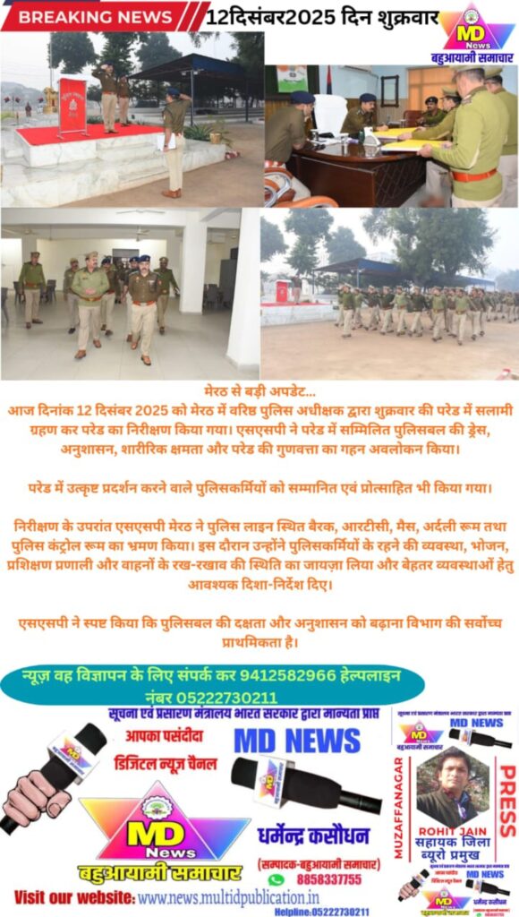 आज दिनांक 12 दिसंबर 2025 को मेरठ में वरिष्ठ पुलिस अधीक्षक द्वारा शुक्रवार की परेड में सलामी ग्रहण कर परेड का निरीक्षण किया गया। एसएसपी ने परेड में सम्मिलित पुलिसबल की ड्रेस, अनुशासन, शारीरिक क्षमता और परेड की गुणवत्ता का गहन अवलोकन किया।