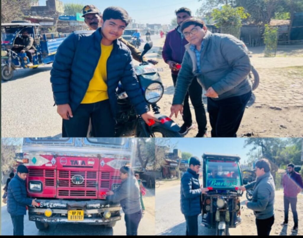 कुकरा खीरी।एक्सीडेंटो को गंभीरता से लेते हुए समाजसेवी डा आई ए ख़ान और उनका समाजसेवी बेटा केन्द्रीय विद्यालय के कक्षा आठ के छात्र दानियाल ख़ान ने सुरक्षा को ध्यान में रखते हुए गाड़ियों पर रेडियम लगाया।