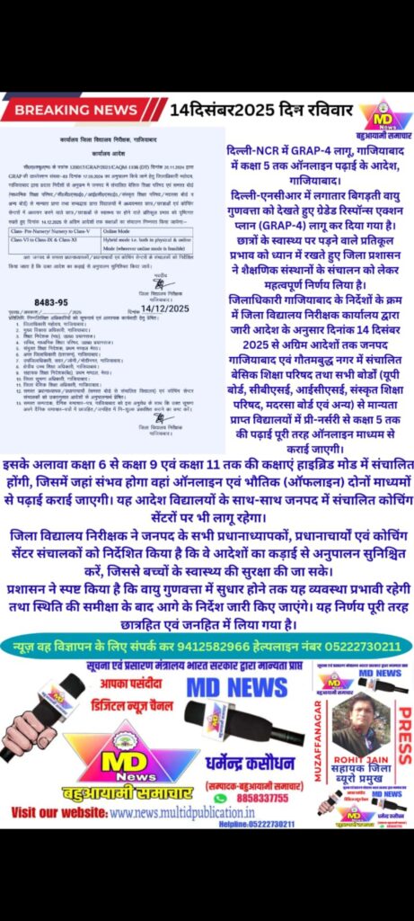 जिलाधिकारी गाजियाबाद के निर्देशों के क्रम में जिला विद्यालय निरीक्षक कार्यालय द्वारा जारी आदेश के अनुसार दिनांक 14 दिसंबर 2025 से अग्रिम आदेशों तक जनपद गाजियाबाद एवं गौतमबुद्ध नगर में संचालित बेसिक शिक्षा परिषद तथा सभी बोर्डों (यूपी बोर्ड, सीबीएसई, आईसीएसई, संस्कृत शिक्षा परिषद, मदरसा बोर्ड एवं अन्य) से मान्यता प्राप्त विद्यालयों में प्री-नर्सरी से कक्षा 5 तक की पढ़ाई पूरी तरह ऑनलाइन माध्यम से कराई जाएगी।