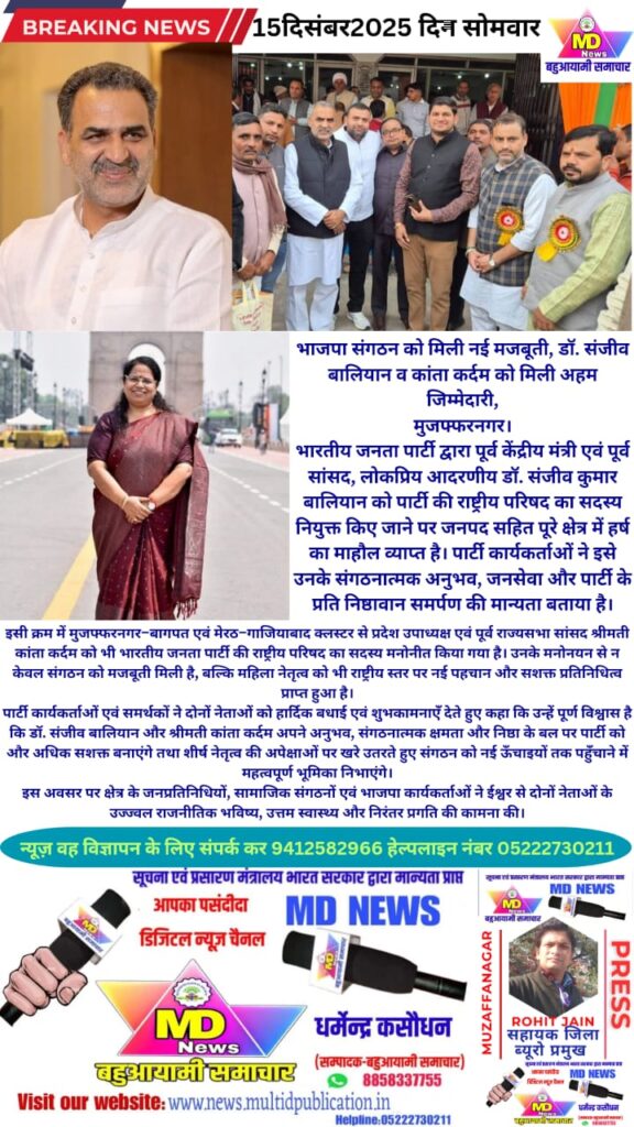 भारतीय जनता पार्टी द्वारा पूर्व केंद्रीय मंत्री एवं पूर्व सांसद, लोकप्रिय आदरणीय डॉ. संजीव कुमार बालियान को पार्टी की राष्ट्रीय परिषद का सदस्य नियुक्त किए जाने पर जनपद सहित पूरे क्षेत्र में हर्ष का माहौल व्याप्त है। पार्टी कार्यकर्ताओं ने इसे उनके संगठनात्मक अनुभव, जनसेवा और पार्टी के प्रति निष्ठावान समर्पण की मान्यता बताया है।