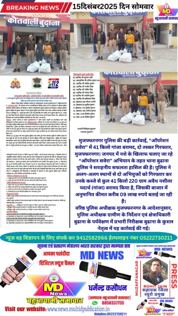 मुजफ्फरनगर। जनपद में नशे के खिलाफ चलाए जा रहे “ऑपरेशन सवेरा” अभियान के तहत थाना बुढाना पुलिस ने सराहनीय सफलता हासिल की है। पुलिस ने अलग-अलग स्थानों से दो अभियुक्तों को गिरफ्तार कर उनके कब्जे से कुल 41 किलो 220 ग्राम अवैध नशीला पदार्थ (गांजा) बरामद किया है, जिसकी बाजार में अनुमानित कीमत करीब 09 लाख रुपये बताई जा रही है।