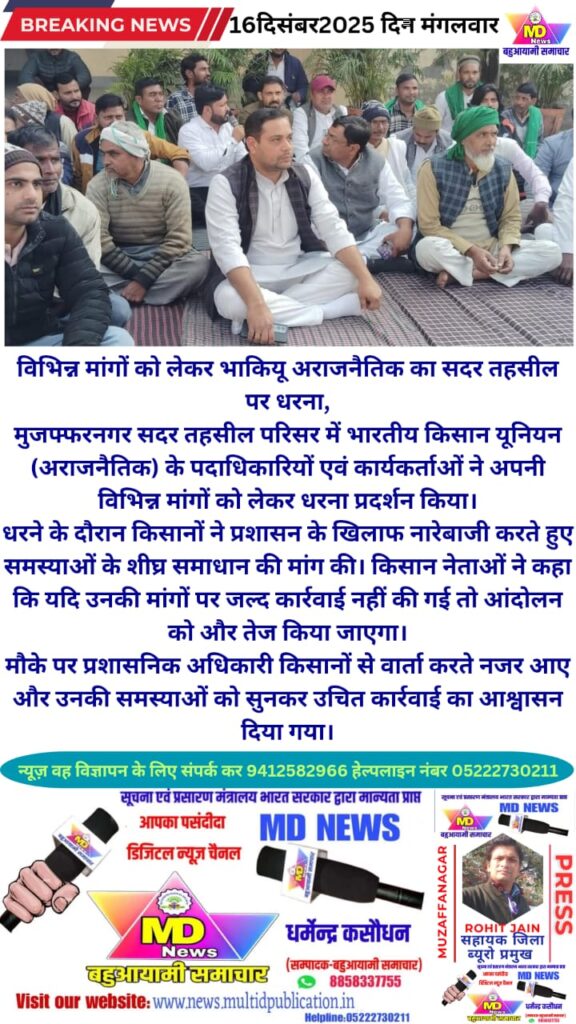 मुजफ्फरनगर सदर तहसील परिसर में भारतीय किसान यूनियन (अराजनैतिक) के पदाधिकारियों एवं कार्यकर्ताओं ने अपनी विभिन्न मांगों को लेकर धरना प्रदर्शन किया।