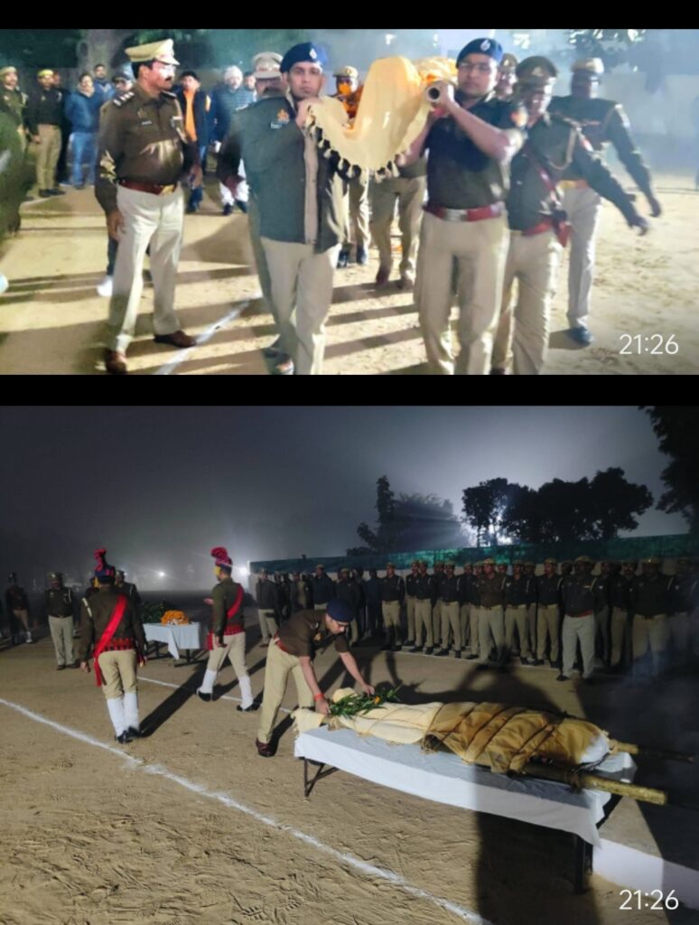गोण्डा। आज दिनांक 16.12.2025 को थाना तरबगंज पर तैनात उ0नि0 इंद्रेश यादव (पी0एन0ओ0- 942530320)को सुबह 10:00 बजे अचानक सीने पर दर्द हुआ था। जिसकारण उनको तत्काल ईलाज हेतु सीएचसी तरबगंज ले जाया गया था जहां पर चिकित्सकों द्वारा उचित ईलाज हेतु उनको जिला अस्पताल गोण्डा रेफर किया गया। जहां पर ईलाज के दौरान उनकी हृदय गति रुक जाने के कारण मृत्यु हो गई थी। पुलिस अधीक्षक गोण्डा श्री विनीत जायसवाल द्वारा उ0नि0 इंद्रेश यादव की असामयिक/दुःखद मृत्यु होने पर रिजर्व पुलिस लाइन्स गोण्डा में शोक परेड का आयोजन कर उनके पार्थिव शरीर को सलामी दी गयी तथा पुष्पचक्र अर्पित कर भावभीनी श्रद्धांजलि दी गयी तथा उ0नि0 के परिजनों को सांत्वना/हरसंभव मदद का अश्वासन देकर पार्थिव शरीर को पैतृक गांव भेजवाया गया।