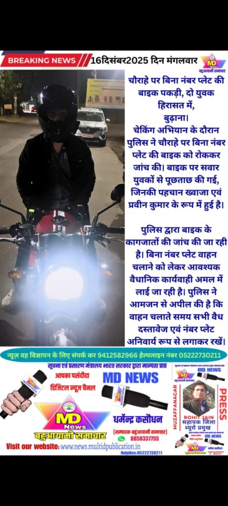 पुलिस द्वारा बाइक के कागजातों की जांच की जा रही है। बिना नंबर प्लेट वाहन चलाने को लेकर आवश्यक वैधानिक कार्यवाही अमल में लाई जा रही है। पुलिस ने आमजन से अपील की है कि वाहन चलाते समय सभी वैध दस्तावेज एवं नंबर प्लेट अनिवार्य रूप से लगाकर रखें।