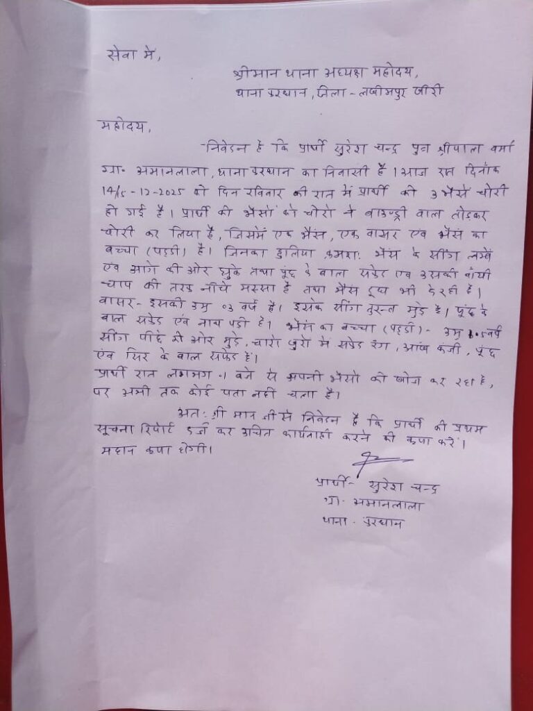 फरधान खीरी। फरधान थाना क्षेत्र के अमानलाला गांव में दिनांक 14/15 दिसम्बर 2025 की रात्रि में सुरेश चन्द्र के घर की बाउंड्री वॉल तोड़कर तीन भैंसों को चोरी का मामला सामने आया है।