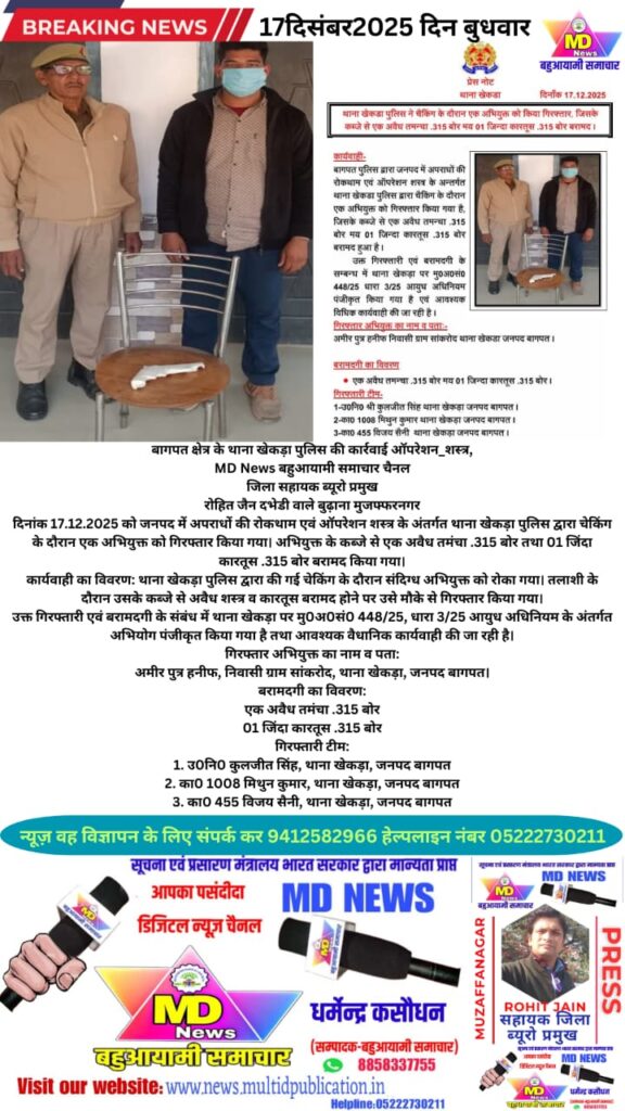 दिनांक 17.12.2025 को जनपद में अपराधों की रोकथाम एवं ऑपरेशन शस्त्र के अंतर्गत थाना खेकड़ा पुलिस द्वारा चेकिंग के दौरान एक अभियुक्त को गिरफ्तार किया गया। अभियुक्त के कब्जे से एक अवैध तमंचा .315 बोर तथा 01 जिंदा कारतूस .315 बोर बरामद किया गया।