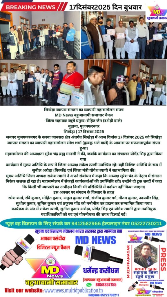 जनपद मुज़फ्फरनगर के कस्बा जानसठ क्षेत्र अंतर्गत सिखेड़ा में आज दिनांक 17 दिसंबर 2025 को सिखेड़ा व्यापार संगठन का व्यापारी महासम्मेलन रमेश शर्मा (कुक्कू भत्ते वाले) के आवास पर सफलतापूर्वक संपन्न हुआ।