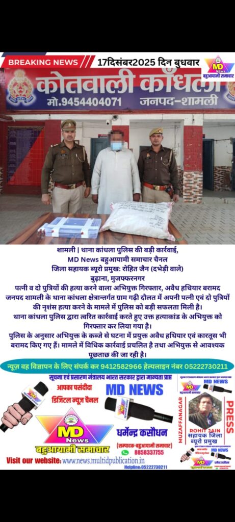 जनपद शामली के थाना कांधला क्षेत्रान्तर्गत ग्राम गढ़ी दौलत में अपनी पत्नी एवं दो पुत्रियों की नृशंस हत्या करने के मामले में पुलिस को बड़ी सफलता मिली है।