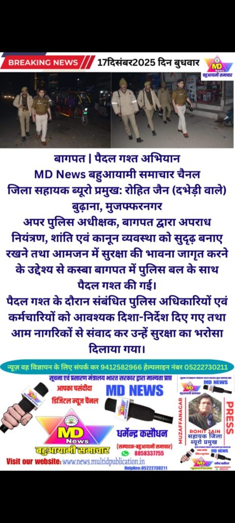 अपर पुलिस अधीक्षक, बागपत द्वारा अपराध नियंत्रण, शांति एवं कानून व्यवस्था को सुदृढ़ बनाए रखने तथा आमजन में सुरक्षा की भावना जागृत करने के उद्देश्य से कस्बा बागपत में पुलिस बल के साथ पैदल गश्त की गई।