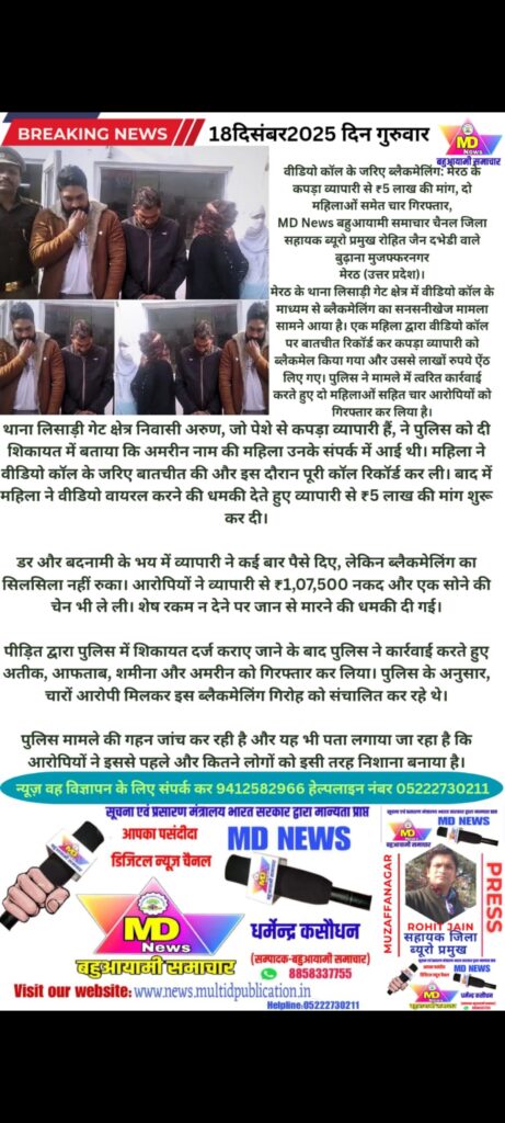 मेरठ के थाना लिसाड़ी गेट क्षेत्र में वीडियो कॉल के माध्यम से ब्लैकमेलिंग का सनसनीखेज मामला सामने आया है। एक महिला द्वारा वीडियो कॉल पर बातचीत रिकॉर्ड कर कपड़ा व्यापारी को ब्लैकमेल किया गया और उससे लाखों रुपये ऐंठ लिए गए। पुलिस ने मामले में त्वरित कार्रवाई करते हुए दो महिलाओं सहित चार आरोपियों को गिरफ्तार कर लिया है।