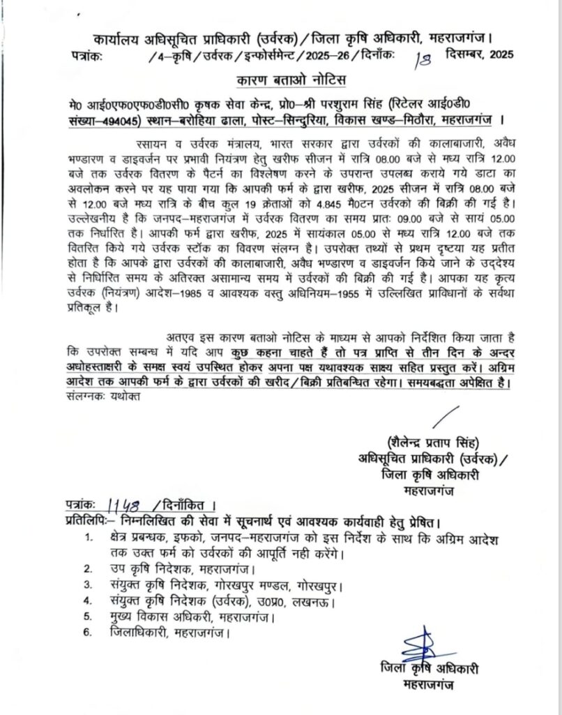 महराजगंज। भारत सरकार के रसायन एवं उर्वरक मंत्रालय द्वारा उर्वरकों की कालाबाजारी, अवैध भंडारण और डाइवर्जन को रोकने के लिए की जा रही निगरानी के क्रम में जनपद में एक बड़ी कार्रवाई सामने आई है। जिला कृषि अधिकारी ने नियमों का उल्लंघन करने वाले एक उर्वरक केंद्र पर तत्काल प्रभाव से खरीद-बिक्री पर प्रतिबंध लगा दिया है।