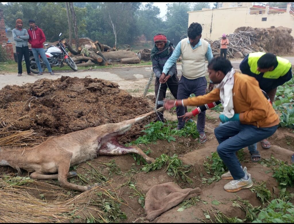 शनिवार की भोर शौच के लिए गये अमदहा के ग्रामीणों ने देखा कि एक नीलगाय कंटीले तारों के बींच फंसी हुई है जिसकी जानकारी जब गांव के गोसेवकों को हुई तो गोसेवकों की पूरी टीम मौके पर पहुंच गई और वन दरोगा गिरजेश कुमार सिंह को सूचना दी। सूचना पर पहुँचे वन दरोगा श्याम लाल ने पशु चिकित्सालय मसौली के पैरावेट राजू यादव एव गौसेवक उमाकांत ,विशाल की मदद से