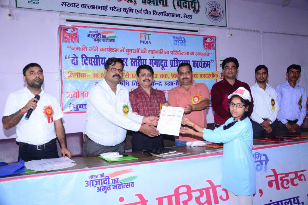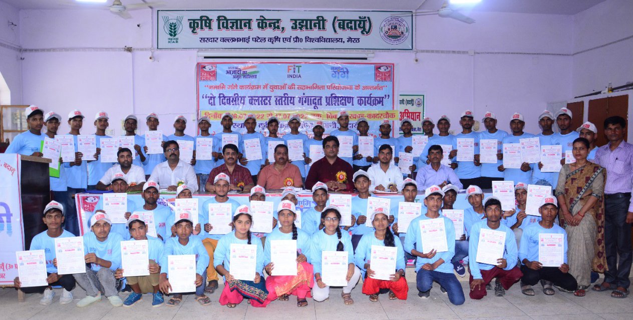 युवा कार्यक्रम और खेल मंत्रालय भारत सरकार के नेहरू युवा केंद्र बदायूं द्वारा संचालित नमामि गंगे परियोजना के अन्तर्गत गंगा दूतों के तृतीय बैच के प्रशिक्षण शिविर का आज कृषि विज्ञान केंद्र उझानी के सभागार में समापन किया गया। इस प्रशिक्षण में प्रशिक्षित युवाओं को गंगा महाआरती कछला के संस्थापक सदस्य वरिष्ठ युवा समाजसेवी किशन चंद शर्मा और जिला युवा अधिकारी डॉ दिनेश यादव ने प्रशिक्षण प्रमाण पत्र प्रदान किए और उनके उज्ज्वल भविष्य की कामना की।