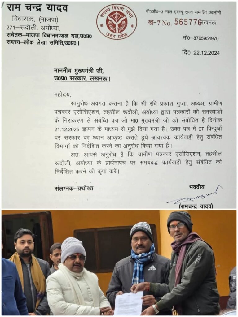 ग्रामीण पत्रकार एसोसिएशन व पत्रकारों की समस्याओं के निस्तारण किए जाने के संबंध में एक सात सूत्रीय ज्ञापन प्रदेश के मुख्यमंत्री योगी आदित्यनाथ के नाम संबोधित रुदौली तहसील अध्यक्ष रवि प्रकाश गुप्त एवं उपाध्यक्ष अमित कुमार मिश्रा ने रुदौली विधायक रामचंद्र यादव को सौंपा है।