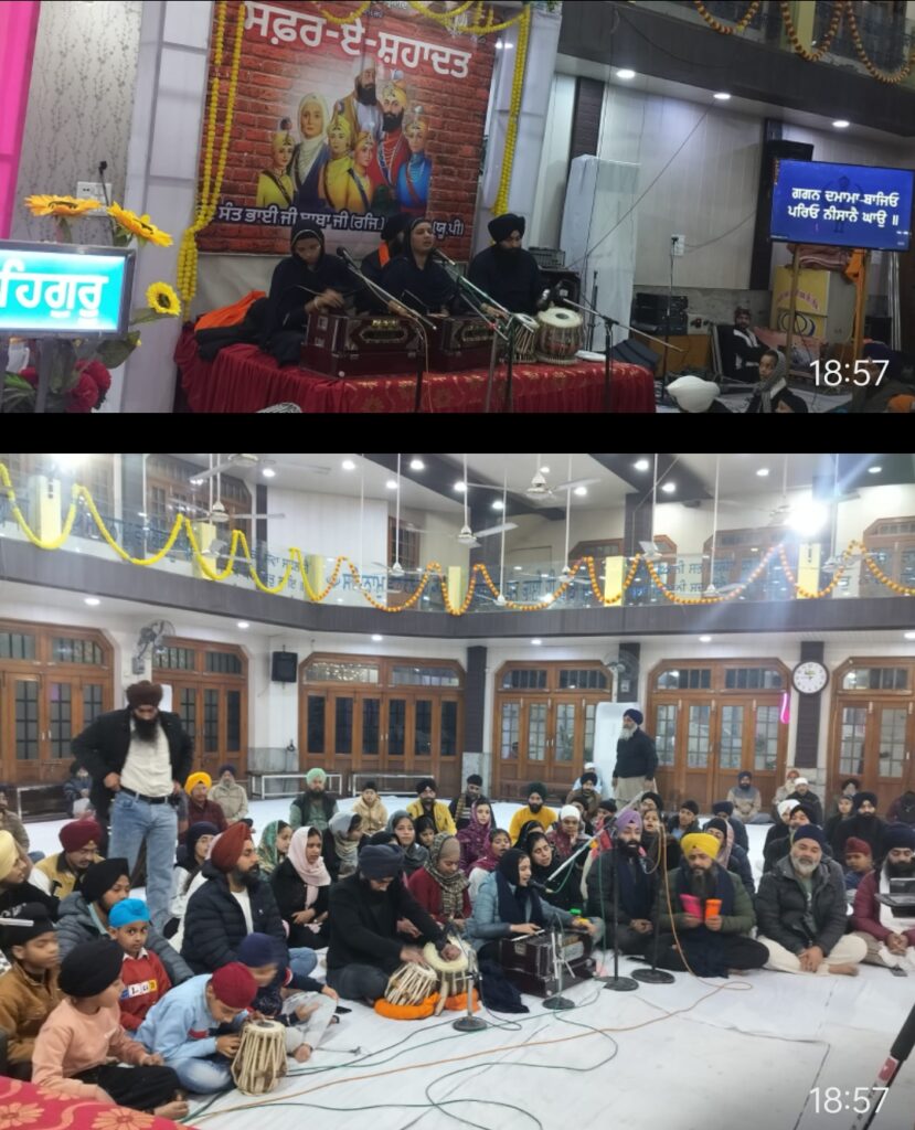 जिसके अंतर्गत बड़े साहबजादौ बाबा अजीत सिंह जी,बाबा जुझार सिंह जी के शहिदी दिवस दिनांक 22 दिसंबर 2025 को मनाए जाने के संबंध में रात्रि 8:00 बजे से शब्द कीर्तन किए गए। सुबह 5:00 से श्री सुखमणि साहिब जी के पाठ एवं श्री नित्य नियम साहिब जी के पाठ हुए शब्द कीर्तन हुए रात्रि कार्यक्रम के अंतर्गत हजूरी रागी जाता भाई कुलदीप सिंह द्वारा शपथ कीर्तन किया गया उसके उपरांत अखंड कीर्तनी जाता द्वारा रात्रि 9:00 बजे तक कीर्तन किया गया रात्रि 9:00 बजे से 11:00 बजे तक बीवी जसप्रीत कौर पटियाला निवासी द्वारा शबद कीर्तन किया गया। अरदास उपरांत गुरु के अटूट लंगर बांटे गए। सफर -ए- शहादत के अंतर्गत गत वर्षो की भांति इस वर्ष भी 40 दिन तक चलने वाले फ्री चाय नाश्ते आदि का स्टॉल रेलवे स्टेशन पर दिनांक 21 दिसंबर से लगातार सुबह 5:30 से 7:00 तक लगाया जा रहा है तथा अधिक सर्दी होने ने के कारण अलाव भी माल गोदाम चौराहा, रेलवे स्टेशन पर जलाये जा रहे हैं। रात्रि कार्यक्रम में गुरुद्वारा प्रबंधक कमेटी के प्रधान दर्शन सिंह खुराना, गुरचरण सिंह आहूजा, त्रिलोचन सिंह, सुरेंद्र सिंह चावला, हरपाल सिंह, महेंद्र सिंह होरा , धनवंत सिंह , प्रेम अरोड़ा, पपिंदर सिंह, तरन दीप सिंह ग्रोवर, राज सिंह, अमरजीत सिंह,रवींद्र सिंह, हरजीत सिंह, जसमीत सिंह, संतोख सिंह खालसा एवं गुरदेव सिंह, निर्वैर सिंह , जगमोहन सिंह निमाना एवं बाहर की एवं कॉलोनी की काफी संगत मौजूद रही।