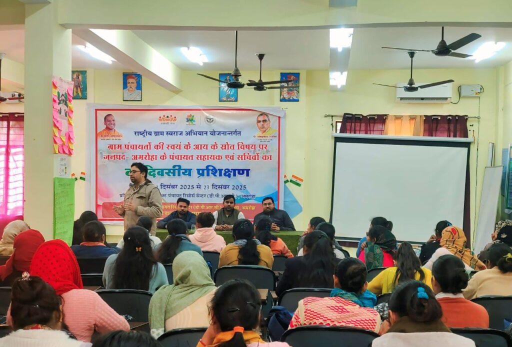 अमरोहा। राष्ट्रीय ग्राम स्वराज अभियान के अन्तर्गत डीपीआरसी गजरौला अमरोहा पर पी एफ एम एस, ई ग्राम स्वराज के साथ गवर्नमेंट ई मार्केटिंग पोर्टल का संबंध विषय पर विकासखंड अमरोहा के सचिवों ,पंचायत सहायकों एवं ग्राम प्रधान का दो दिवसीय प्रशिक्षण का समापन किया गया। प्रशिक्षण में प्रशिक्षक अब्दुल कादिर ने पंचायत सहायकों,प्रधानों एवं सचिवों को पीएफएमएस पोर्टल, ई ग्राम स्वराज पोर्टल एवं जैम पोर्टल के माध्यम से खरीदारी करने की प्रक्रिया को समझाना है, जिससे कि वह ग्राम पंचायत के कार्यों को आसानी से कर सके। प्रशिक्षण में प्रशिक्षक नितिन द्वारा ई ग्राम स्वराज पोर्टल पर एडमिन आई डी के माध्यम से कौन-कौन से कार्य किए जा सकते हैं इसको विस्तार से समझाया एवं इसके साथ ही लाइव प्रेक्टिकल करके भी दिखाया। इस प्रशिक्षण को प्राप्त कर पंचायत सहायक बहुत ही खुश हुए। द्वारा ई ग्राम स्वराज पोर्टल पर प्रकाश डालते हुए बताया गया कि ई ग्राम स्वराज पोर्टल पर पंचायत प्रोफाइल, प्लानिंग एवं नियोजन, अकाउंटिंग तथा ऑडिट आदि कार्य आसानी के साथ किए जाते हैं।
