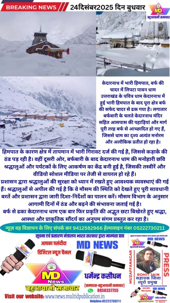 हिमपात के कारण क्षेत्र में तापमान में भारी गिरावट दर्ज की गई है, जिससे कड़ाके की ठंड पड़ रही है। वहीं दूसरी ओर, बर्फबारी के बाद केदारनाथ धाम की मनोहारी छवि श्रद्धालुओं और पर्यटकों के लिए आकर्षण का केंद्र बनी हुई है, जिसकी तस्वीरें और वीडियो सोशल मीडिया पर तेजी से वायरल हो रहे हैं।