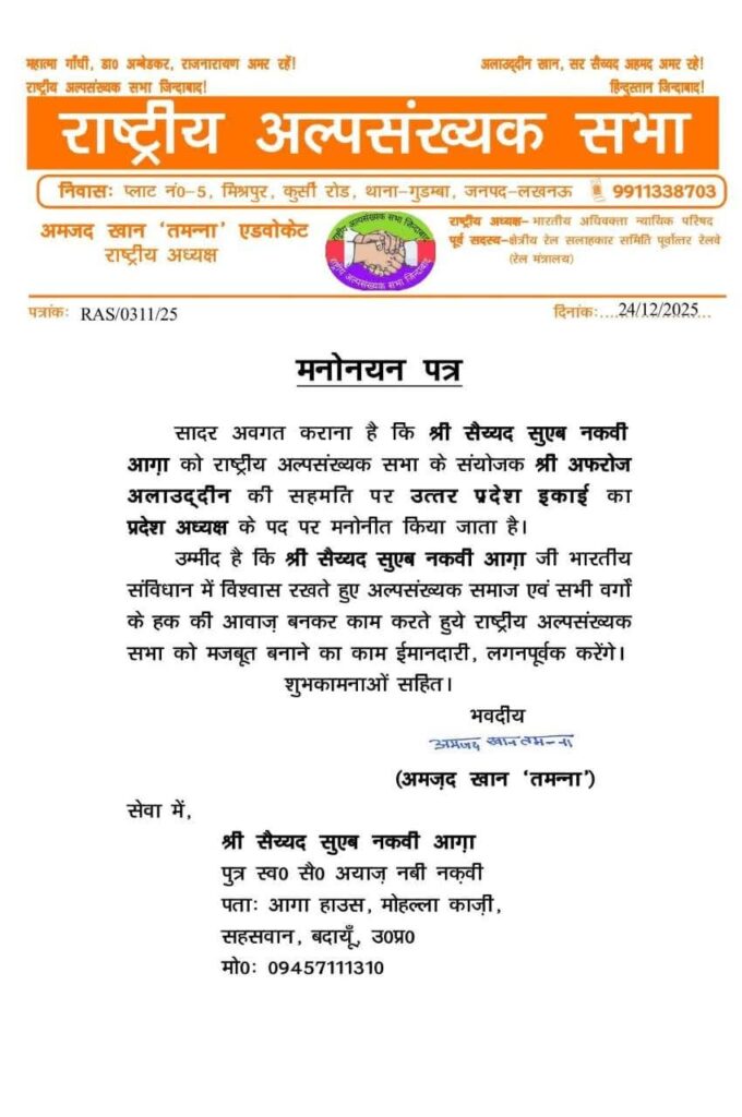 सहसवान (बदायूं) उत्तर प्रदेश, 24 दिसंबर 2025 राष्ट्रीय अल्पसंख्यंक सभा ने खुशी के साथ घोषणा की है कि संगठन के राष्ट्रीय सचिव सैय्यद शुएब नकवी आग़ा को राष्ट्रीय संयोजक अफरोज अलाउद्दीन की सहमति से उत्तर प्रदेश इकाई का प्रदेश अध्यक्ष मनोनीत किया गया है।इस नियुक्ति पर राष्ट्रीय अल्पसंख्यंक सभा के पदाधिकारी और सदस्य यह आशा व्यक्त कर रहे हैं कि श्री नकवी आग़ा भारतीय संविधान के प्रति दृढ़ विश्वास रखते हुए