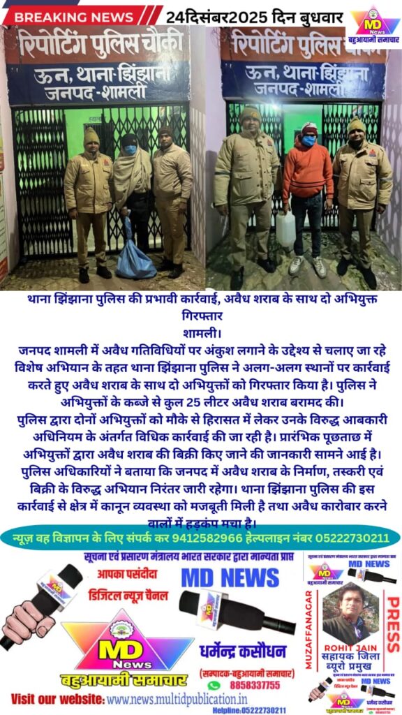 जनपद शामली में अवैध गतिविधियों पर अंकुश लगाने के उद्देश्य से चलाए जा रहे विशेष अभियान के तहत थाना झिंझाना पुलिस ने अलग-अलग स्थानों पर कार्रवाई करते हुए अवैध शराब के साथ दो अभियुक्तों को गिरफ्तार किया है। पुलिस ने अभियुक्तों के कब्जे से कुल 25 लीटर अवैध शराब बरामद की।