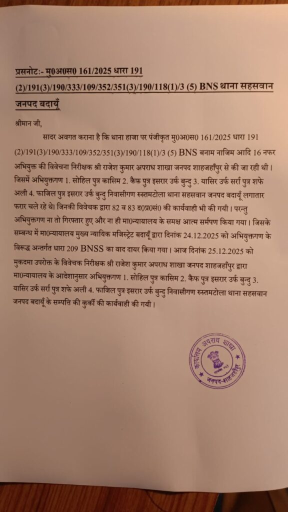 उनमें सोहिल पुत्र कासिम, कैफ पुत्र इसरार, यासिर पुत्र शफे अली और फाजिल पुत्र इसरार शामिल है कार्रवाई के दौरान आरोपियों के परिजनों ने पुलिस का विरोध करने का प्रयास किया, लेकिन पुलिस की संख्ती के चलते वे खुलकर विरोध नहीं कर सके। एसएचओ सहसवान धनंजय सिंह ने बताया कि नामजदों की चल संपत्ति कुर्क कर ली गई है और कोर्ट को पूरी स्थिति से अवगत कर दिया जाएगा। उन्होंने यह भी बताया कि यदि आरोपियों ने अब भी आत्म संपूर्ण नहीं किया, तो कोर्ट की अनुमति लेकर उनकी अचल संपत्ति भी कुर्क की जाएगी ।