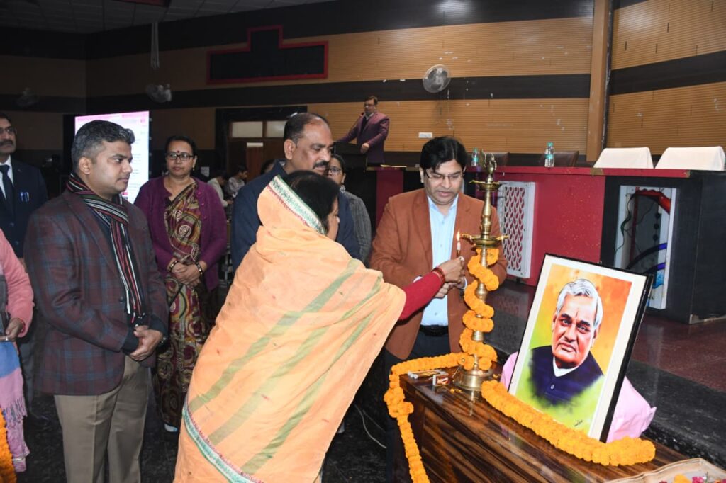 सांसद व अन्य अतिथियों के द्वारा दीप प्रज्जवलन कर एवं स्व0 अटल बिहारी वाजपेयी जी के चित्र पर माल्यार्पण कर कार्यक्रम का किया गया शुभारम्भ