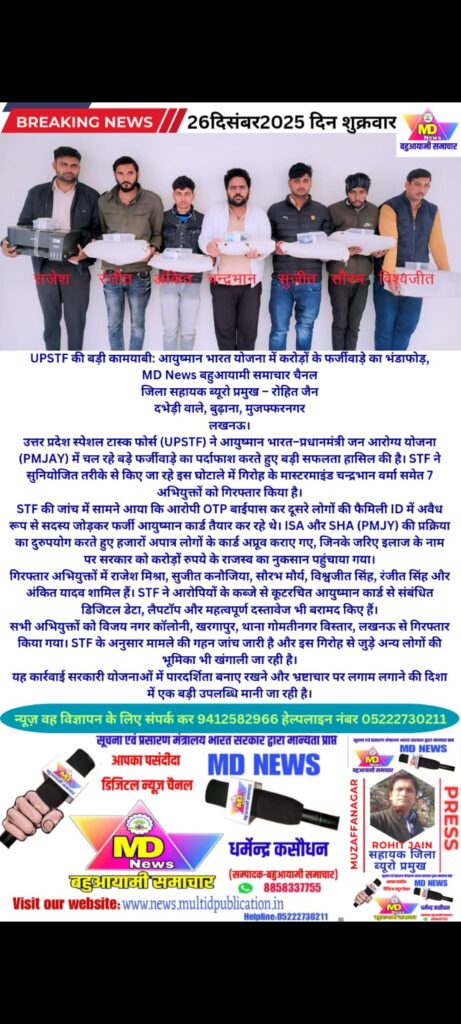 उत्तर प्रदेश स्पेशल टास्क फोर्स (UPSTF) ने आयुष्मान भारत–प्रधानमंत्री जन आरोग्य योजना (PMJAY) में चल रहे बड़े फर्जीवाड़े का पर्दाफाश करते हुए बड़ी सफलता हासिल की है। STF ने सुनियोजित तरीके से किए जा रहे इस घोटाले में गिरोह के मास्टरमाइंड चन्द्रभान वर्मा समेत 7 अभियुक्तों को गिरफ्तार किया है।