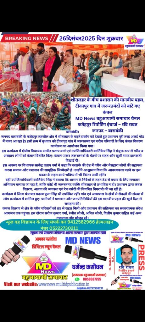 जनपद बाराबंकी के फतेहपुर तहसील क्षेत्र में शीतलहर के बढ़ते प्रकोप को देखते हुए प्रशासन पूरी तरह अलर्ट मोड में नजर आ रहा है। इसी क्रम में बुधवार को टीकापुर गांव में जरूरतमंद एवं गरीब परिवारों के लिए कंबल वितरण कार्यक्रम का आयोजन किया गया।