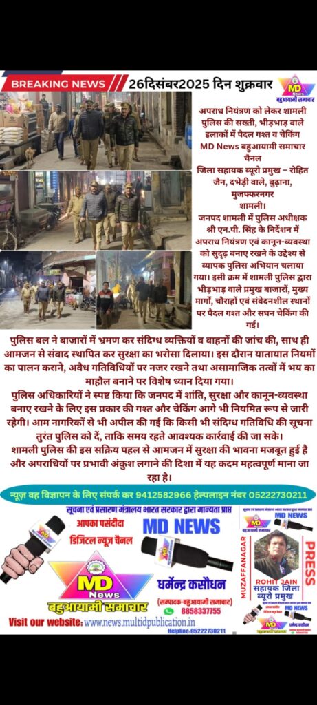 जनपद शामली में पुलिस अधीक्षक श्री एन.पी. सिंह के निर्देशन में अपराध नियंत्रण एवं कानून-व्यवस्था को सुदृढ़ बनाए रखने के उद्देश्य से व्यापक पुलिस अभियान चलाया गया। इसी क्रम में शामली पुलिस द्वारा भीड़भाड़ वाले प्रमुख बाजारों, मुख्य मार्गों, चौराहों एवं संवेदनशील स्थानों पर पैदल गश्त और सघन चेकिंग की गई।