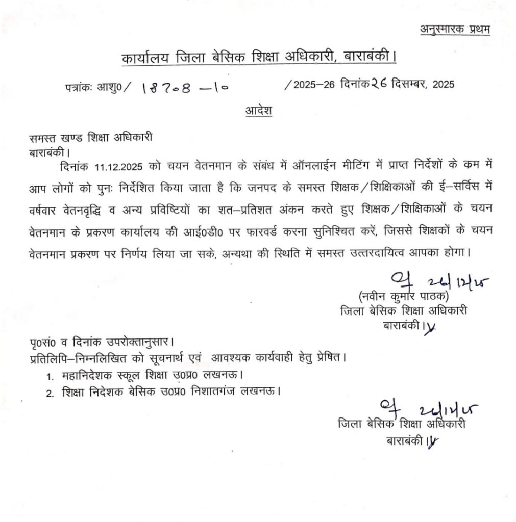 शिक्षकों के चयन वेतनमान को लेकर शुक्रवार को यूनाइटेड टीचर एसोसिएशन बाराबंकी के जिला अध्यक्ष डॉ आशुतोष कुमार ने जिला बेसिक शिक्षा अधिकारी को पत्र सौंपा l पत्र में उन्होंने कहा कि जनपद के हजारों शिक्षक जो 10 वर्ष की सकुशल सेवा पूर्ण कर चुके हैं उनके चयन वेतनमानआदेश आज भी लंबित है ,जबकि प्रतापगढ़, हरदोई आदि जनपदों में हजारों की संख्या में ऑनलाइन आदेश पिछले दिनों निर्गत हो चुके हैं lउन्होंने पत्र में जनपद के अधिकांश शिक्षकों की ऑनलाइन सेवा पंजिका में वार्षिक वेतन वृद्धि एवं अन्य विवरण अद्यतन कराकर चयन वेतनमान स्वीकृत आदेश तत्काल निर्गत किए जाने की आवश्यकता जताई है उन्होंने कहा कि इससे शासन एवं विभाग की मंशा अनुरूप पारदर्शिता बनी रहेगी l चयन वेतनमान स्वीकृत आदेश निर्गत ना होने से जनपद के प्रभावित शिक्षकों में रोष उत्पन्न हो रहा है l अगर ऐसा ही रहा तो संगठन धरना प्रदर्शन को बाध्य होगा l जिसकी समस्त जिम्मेदारी विभाग की होगी l