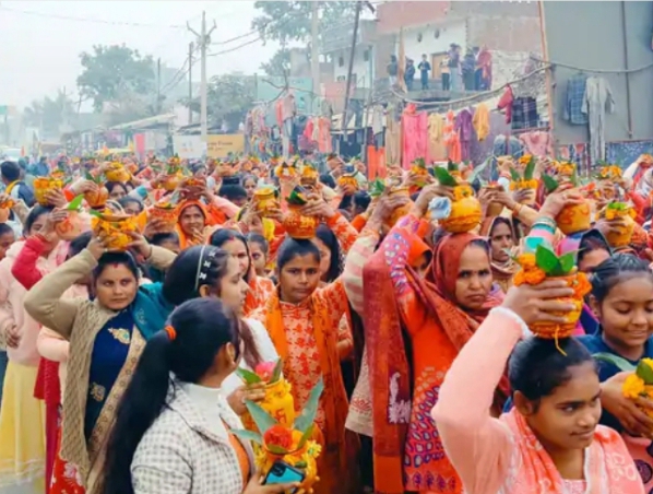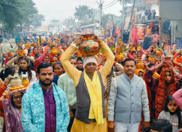 यज्ञ मंडप से पौराणिक कष्ट हरण धाम शिव मंदिर तक गाने, बाजे के साथ कलश यात्रा निकाली गई। इसमें माताएं और बहनें सिर पर कलश रखकर भजन गाती हुई कष्ट हरण धाम पहुंची। वह वैदिक मंत्रोचारण के साथ कलशों में जल भरा गया। पैदल यात्रा करते हुए महिलाएं पुनः यज्ञ मंडप तक पहुंची और कलशों को स्थापित किया।