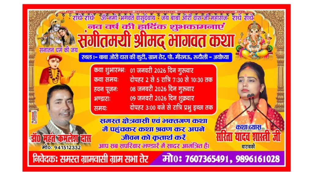नववर्ष के पावन अवसर पर अयोध्या जनपद के रुदौली क्षेत्र अंतर्गत ग्राम तेर में संगीतमयी श्रीमद्भागवत कथा का भव्य आयोजन किया जा रहा है। यह धार्मिक आयोजन बाबा ओरी दास जी महाराज की कुटी, ग्राम तेर, पोस्ट मीरमऊ, रुदौली-अयोध्या में संपन्न होगा।