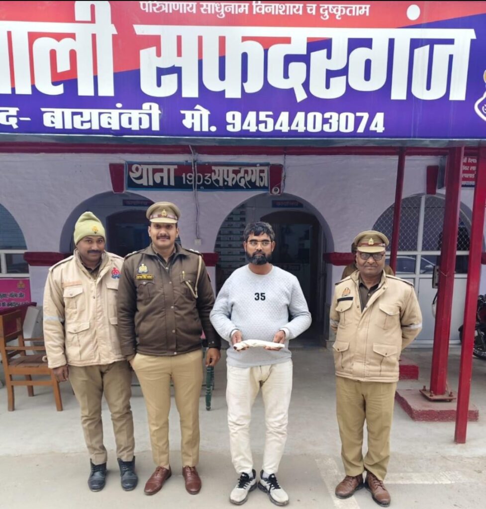 पुलिस अधीक्षक अर्पित विजयवर्गीय द्वारा जनपद में अपराध पर प्रभावी नियंत्रण लगाने हेतु अपराधियों के विरुद्ध चलाये जा रहे अभियान के क्रम में शनिवार को स्वॉट/सर्विलांस व थाना सफदरगंज पुलिस टीम ने मैनुअल इंटेलीजेंस व डिजिटल डेटा के मदद से यूपी गैंगेस्टर एक्ट में वांछित 10 हजार रूपये का इनामियां अभियुक्त मो0 हनीफ पुत्र स्व0 मोहर्रम अली निवासी ग्राम मकदूमपुर थाना कोठी जनपद बाराबंकी को गिरफ्तार कर अभियुक्त के कब्जे से एक अदद अवैध तमंचा .315 बोर मय एक अदद जिन्दा कारतूस .315 बोर बरामद कर किया। अभियुक्त तीन मुकदमो मे वांछित चल रहा था।