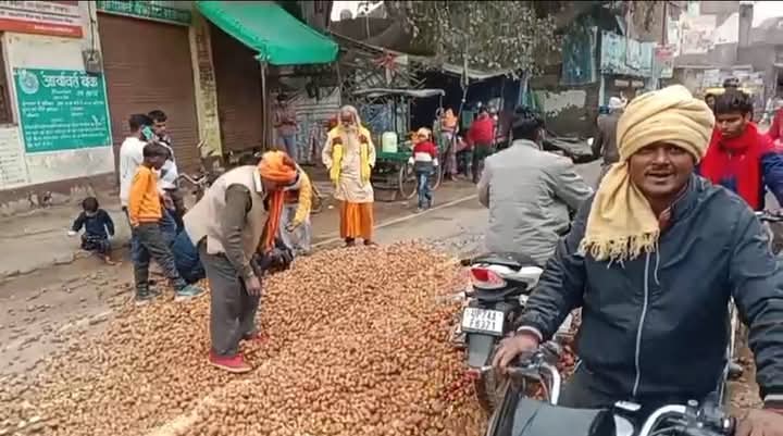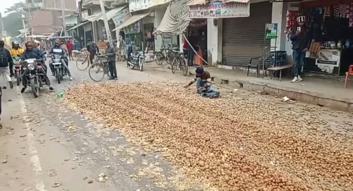 कन्नौज के सकरावा क्षेत्र में किसानों ने अनोखा प्रदर्शन किया है – गुस्से और लाचारी में अपनी मेहनत का सारा आलू बीच सड़क पर फेंक दिया।