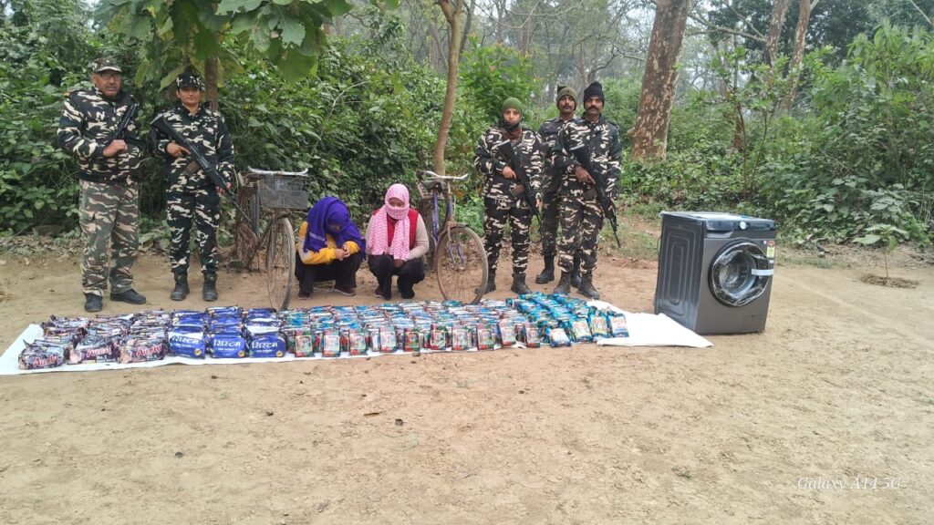 बसही भारत-नेपाल सीमा के बसही में तैनात 49 वी वाहिनी सशस्त्र सीमा बल (एसएसबी) ने मंगलवार करीब 11:30 भारत से नेपाल ले जाई जा रही गुटखा, स्वीट सुपारी, बीड़ी व वाशिंग मशीन का समान बरामद कर दो नेपाली महिला कैरियर को भी पकड़ा है । भारत-नेपाल सीमा पर तैनात 49वीं वाहिनी एसएसबी के उप निरीक्षक सामान्य कमांडर अमोल सिंह ने बताया कि मंगलवार की सुबह एसएसबी की गश्ती टोली ने पिलर संख्या 769/16 के पास नाका लगाया था। जहां पर भारत से नेपाल सामान ले जाते कुछ नेपाली महिला कैरियरों को देखकर जवानों ने रोकने की कोशिश की। इसके बाद नेपाली महिला कैरियर सामान फेंककर भागने लगीं। एसएसबी के जवानों ने दो नेपाली महिला कैरियरों को पकड़ा है। बरामद समान को खोलने पर उसमें से गुटका, स्वीट सुपारी , बीड़ी , वाशिंग मशीन समेत अन्य सामान बरामद हुआ है। एसएसबी ने अठहत्तर हज़ार आठ सौ अस्सी रुपये का सीजर बनाकर दोनों नेपाली महिला कैरियरों समेत पलिया कस्टम के सुपुर्द कर दिया है।