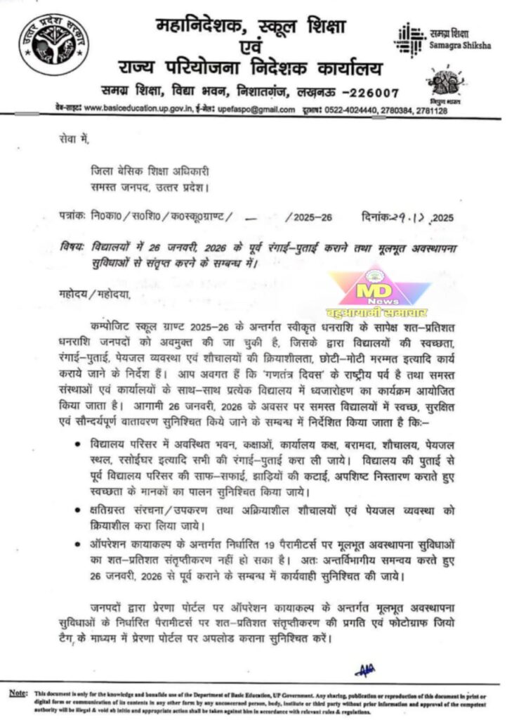 इसमें कहा गया है कि इस अवधि के पहले स्कूलों की साफ-सफाई व मूलभूत अवस्थापना सुविधाओं को बेहतर किया जाए। परिषदीय विद्यालयों में विद्यार्थियों के लिए स्वच्छ, सुरक्षित और सुव्यवस्थित शैक्षिक वातावरण तैयार किया जाए। गणतंत्र दिवस पर राष्ट्रीय पर्व को गरिमामय ढंग से मनाने के लिए विद्यालय परिसर को पूरी तरह स्वच्छ व सुरक्षित बनाया जाए।विद्यालय भवन, कक्षाएं, कार्यालय कक्ष, बरामदे, शौचालय, पेयजल स्थल, रसोईघर सहित सभी स्थानों की नियमित व व्यापक साफ-सफाई की जाए। परिसर में फैले कचरे और अपशिष्ट पदार्थों के समुचित निस्तारण पर ध्यान दिया जाए।इन सभी कार्यो का निरीक्षक ज़िलों के बेसिक शिक्षा अधिकारी को सौंपा गया है।