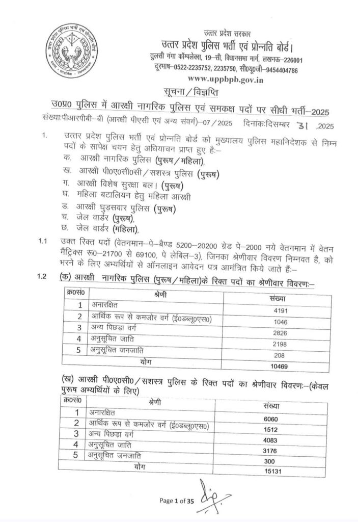 लखनऊ।सूबे के मुखिया योगी आदित्यनाथ ने प्रदेश के युवाओं के लिए नए वर्ष के पहले ही यूपी पुलिस में विभिन्न पदों के 32679 भर्ती प्रक्रिया के लिए आवेदन शुरू कर दिया। कॉन्स्टेबल, जेल वॉर्डर, विशेष सुरक्षा बल, घुड़सवार और अन्य पदों को मिलाकर कुल 32679 हजार से ज्यादा पदों पर आवेदन आमंत्रित किए गए हैं। हाल ही में उत्तर प्रदेश पुलिस भर्ती एंव प्रोन्नति बोर्ड (UPPRPB) ने इस भर्ती का नोटिफिकेशन जारी कर दिया है। साथ में ऑफिशियल वेबसाइट uppbpb.gov.in पर आवेदन प्रक्रिया भी आज से ही शुरू कर दी गई है।