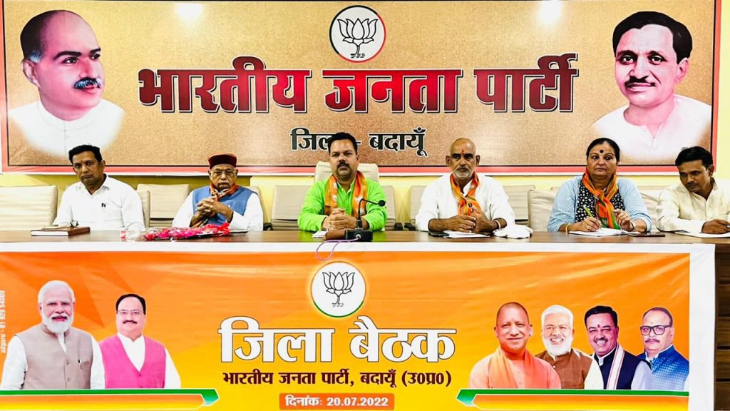 बदायूं : भाजपा कार्यालय पर आगामी कार्यक्रम की योजना हेतु महत्वपूर्ण बैठक सम्पन हुई। बैठक में मुख्य अतिथि क्षेत्रीय महामंत्री/ जिला प्रभारी राकेश मिश्र अनावा एवं अध्यक्षता जिलाध्यक्ष राजीव कुमार गुप्ता ने की। बैठक को सम्बोधित करते हुए क्षेत्रीय महामंत्री/जिला प्रभारी राकेश मिश्र अनावा ने कहा आजादी के 75 वर्ष पूर्ण होने पर अमृत महोत्सव में जनपद बदायूं के हर घर में तिरंगा लहराएगा। हर घर तिरंगा अभियान 13 से 15 अगस्त तक बड़े हर्ष और उल्लास के साथ मनाया जाएगा। भारतीय जनता पार्टी के कार्यकर्ता प्रत्येक बूथ पर हर घर में तिरंगा लहराएंगे। इसके लिए पार्टी ने व्यापक स्तर पर तैयारियां शुरू कर दी हैं। 31 जुलाई को प्रत्येक बूथ पर मन की बात कार्यक्रम के माध्यम से पीएम नरेंद्र मोदी का उद्बोधन सुना जाएगा।
