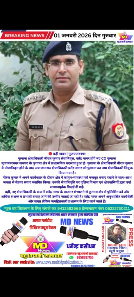 मुजफ्फरनगर जनपद के फुगाना क्षेत्र में प्रशासनिक बदलाव हुआ है। फुगाना के क्षेत्राधिकारी नीरज कुमार के सेवानिवृत्त होने के बाद अब जानसठ क्षेत्राधिकारी यतेंद्र नागर को फुगाना का नया क्षेत्राधिकारी नियुक्त किया गया है।