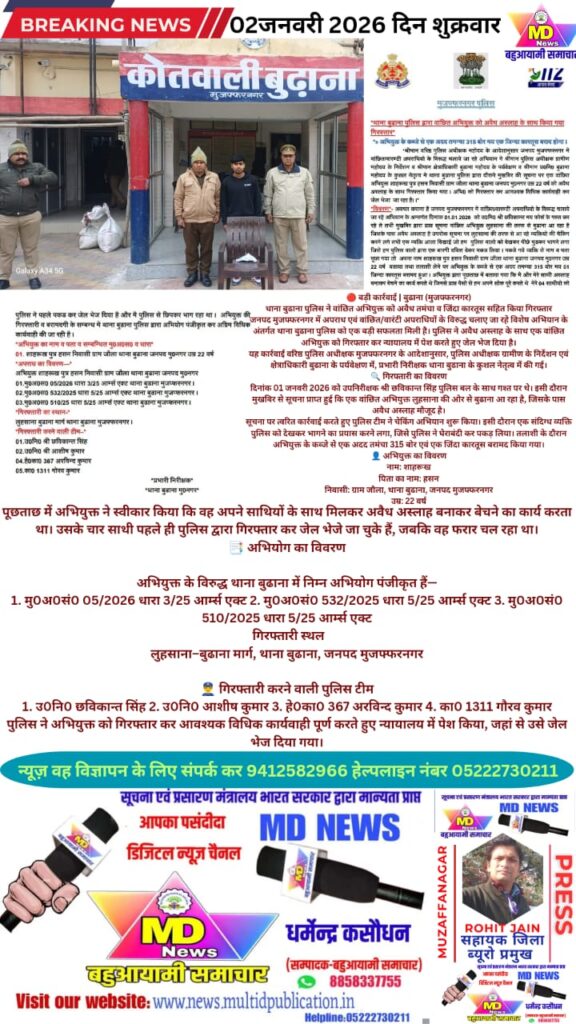 जनपद मुजफ्फरनगर में अपराध एवं वांछित/वारंटी अपराधियों के विरुद्ध चलाए जा रहे विशेष अभियान के अंतर्गत थाना बुढाना पुलिस को एक बड़ी सफलता मिली है। पुलिस ने अवैध अस्लाह के साथ एक वांछित अभियुक्त को गिरफ्तार कर न्यायालय में पेश करते हुए जेल भेज दिया है।