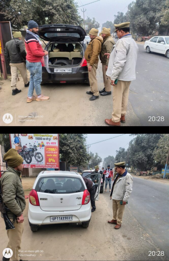 मुजफ्फरनगर, रामराज। वरिष्ठ पुलिस अधीक्षक मुजफ्फरनगर में संजय वर्मा एवं थाना रामराज प्रभारी रवेंद्र सिंह यादव के कुशल निर्देशन में आज दिनांक 03,01,2026,को रामराज थाना क्षेत्र के स्टेट बैंक पर थाना प्रभारी रवेंन्द्र सिहं यादव व उपनिरीक्षक जयसिंह नागर ने पुलिस के साथ चलाया गया चेकिंग अभियान। वाहन चालकों की गहनता से जांच की गई। जिससे संदिग्ध व्यक्तियों की पहचान हो सके। चेकिंग अभियान के दौरान बिना नंबर प्लेट बिना हेलमेट बिना सीट बेल्ट, वाहनों के ऑन लाइन चालान भी काटे गए। और चार पहिया वाहनों की तलाशी भी ली गई। पुलिस टीम ने यातायात नियमों का पालन करने के सख्त आदेश दिए। और क्षेत्र में कानून व्यवस्था और यातायात के नियमों का पालन कराने के लिए सख्त आदेश दिए। ओर सुरक्षा व्यवस्था के मद्देनजर नियमित रूप से यह चेकिंग अभियान चलता रहेगा।