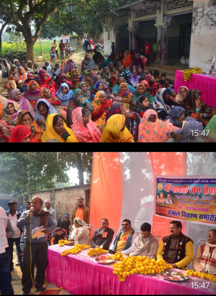 वाराणसी माँ गायत्री जन सेवा ट्रस्ट रजला (कुशही) चोलापुर के द्वारा नव वर्ष के मौके पर ठंड से राहत के लिए बुजुर्गो, असहाय, महिलाओ सहित करीब 200 लोगों को दिया कम्बल वितरण किया गया| साथ ही नव वर्ष के मौके पर आसपास के गाँव के उपस्थित बच्चों भरपूर नाश्ता कराया गया,आपको बता दे की हर वर्ष की भांति इस बार नव वर्ष के पहले दिन माँ गायत्री जन सेवा ट्रस्ट रजला (कुसही) चोलापुर क्षेत्र में कड़ाके की ठंड के बीच असहाय व वृद्ध जनों को निःशुल्क कम्बल का वितरण किया गया। बृहस्पतिवार को दोपहर में ट्रस्ट के संस्थापक/समाजसेवी व डॉ गौरी शंकर दूबे ने प्रतिवर्ष की भांति इस वर्ष भी क्षेत्र के रजला, उद्योरामपुर, बाबतपुर, कुरौली, नियारडीह, हथियरकला, पूरेधुरशाह, अजगरा गाँव के करीब 200 असहाय व वृद्धजनों को कम्बल दिया। कार्यक्रम के मुख्य अतिथि श्री कृष्णानंद पाण्डेय, विशिष्ट अतिथि श्री अनिल मिश्रा (बबलू गुरु), व उनकी धर्मपत्नी श्रीमती किरन मिश्रा, श्री कपिल नारायण पाण्डेय व कार्यक्रम अध्यक्षता श्री वीरेंद्र सिंह (प्रबंधक आदर्श इंटर कॉलेज रेहारी के द्वारा किया गया,इस दौरान आसपास के 20 गांव के ग्राम प्रधान, समाजसेवी उपस्थित थे, कार्यक्रम का संचालन श्री संतोष शुक्ला ने किया, इस कार्यक्रम में प्रमुख रूप से श्री शिवाजी सिंह,श्री मनोज चौबे (प्रबंधक सरला लर्नर्स एकेडमी ), हरिमंगल सिंह, अभिमन्यु सिंह, शैल मिश्रा,श्री गोपाल सिंह, कमला राजभर (प्रधान) रमेश माली, संदीप मिश्रा, विनय श्रीवास्तव, जुगुनू यादव, गणेश चौरसिया, गुड्डू मौर्या (प्रधान) छोटू चौबे, संजय नाविक,सहित क्षेत्र के सभी समाजसेवी प्रमुख रूप से उपस्थित थे, कार्यक्रम का धन्यवाद ज्ञापन श्री कपिल नारायण पाण्डेय (ट्रस्ट के संरक्षक) व अध्यक्ष डॉ गौरी शंकर दूबे ने किया,