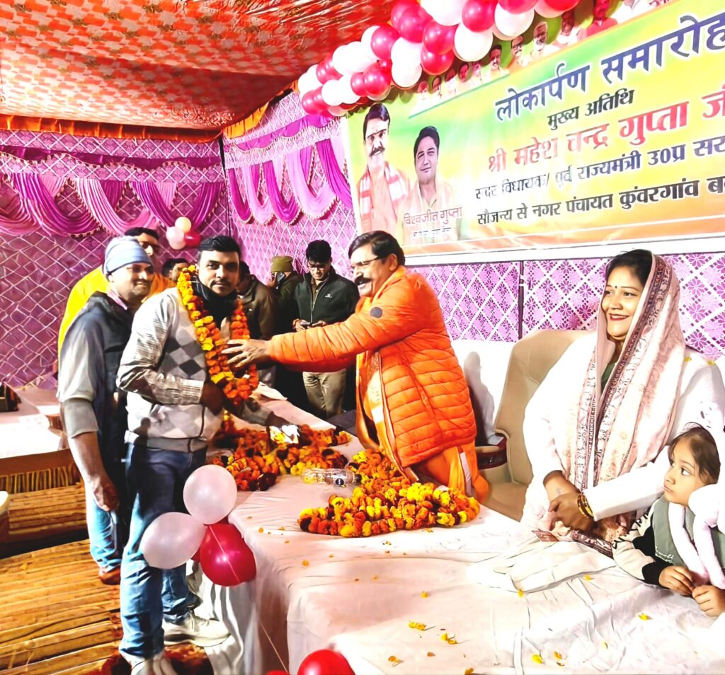 बदायूं, कुंवरगांव नगर के समग्र विकास की दिशा में शुक्रवार को एक अहम कदम उठाया गया। लगभग एक करोड़ रुपये की लागत से पूर्ण हुए विभिन्न विकास कार्यों का पूर्व राज्यमंत्री व सदर विधायक महेश चंद्र गुप्ता ने विधिवत लोकार्पण किया। कार्यक्रम के दौरान नगरवासियों में खासा उत्साह देखने को मिला।सदर विधायक ने बताया कि श्मशान भूमि स्थल का निर्माण 30 लाख रुपये की लागत से कराया गया है, जबकि नगर की प्रकाश व्यवस्था को सुदृढ़ बनाने के लिए 58 लाख रुपये की लागत से स्ट्रीट लाइटें लगाई गई हैं। वहीं दशवां स्थल का निर्माण 10 लाख रुपये की लागत से कराया गया। उन्होंने बताया कि इसके अतिरिक्त नगर में लगभग चार करोड़ रुपये के अन्य विकास कार्य प्रगति पर हैं, जिन्हें शीघ्र पूर्ण कराया जाएगा।कार्यक्रम को संबोधित करते हुए नगर पंचायत अध्यक्ष ज्योति रानी ने कहा कि नगर पंचायत के अंतर्गत कराए गए सभी विकास कार्य आमजन की मूलभूत आवश्यकताओं को ध्यान में रखकर किए गए हैं। स्वच्छता, प्रकाश व्यवस्था और सार्वजनिक सुविधाओं का विस्तार नगर पंचायत की प्राथमिकता है। उन्होंने सदर विधायक का आभार व्यक्त करते हुए कहा कि उनके सहयोग से नगर में निरंतर विकास कार्य संभव हो पा रहे हैं।कार्यक्रम के दौरान सदर विधायक ने बुजुर्गों को कंबल वितरित कर ठंड से राहत पहुंचाई, वहीं स्वच्छता को बढ़ावा देने के उद्देश्य से नगरवासियों को 300 डस्टबीन वितरित किए। इस अवसर पर थाना प्रभारी राजेश कौशिक, अवनीश शंखधार, सोबरन सिंह व नौरंग पाल को शाल ओढ़ाकर सम्मानित किया गया।कार्यक्रम में नगर पंचायत अध्यक्ष पति अरविंद रावत, ठाकुर अनिल सिंह, शरद भारद्वाज, किशनवीर रावत, प्रेमपाल रावत, राम शर्मा, लवी शर्मा, अंकित पाठक, गुड्डू गुप्ता, नितिन शर्मा, नौरंग पाल, लालू सभासद, विनय पाठक, विकास गिरी, हनी मिश्रा, देवेश सक्सेना, दीपक रावत, सुगम वार्ष्णेय, अर्जुन राठौर, रमन वार्ष्णेय, महिपाल रस्तोगी, विजेंद्र पाल, नबाब मियां सहित बड़ी संख्या में नगरवासी मौजूद रहे।