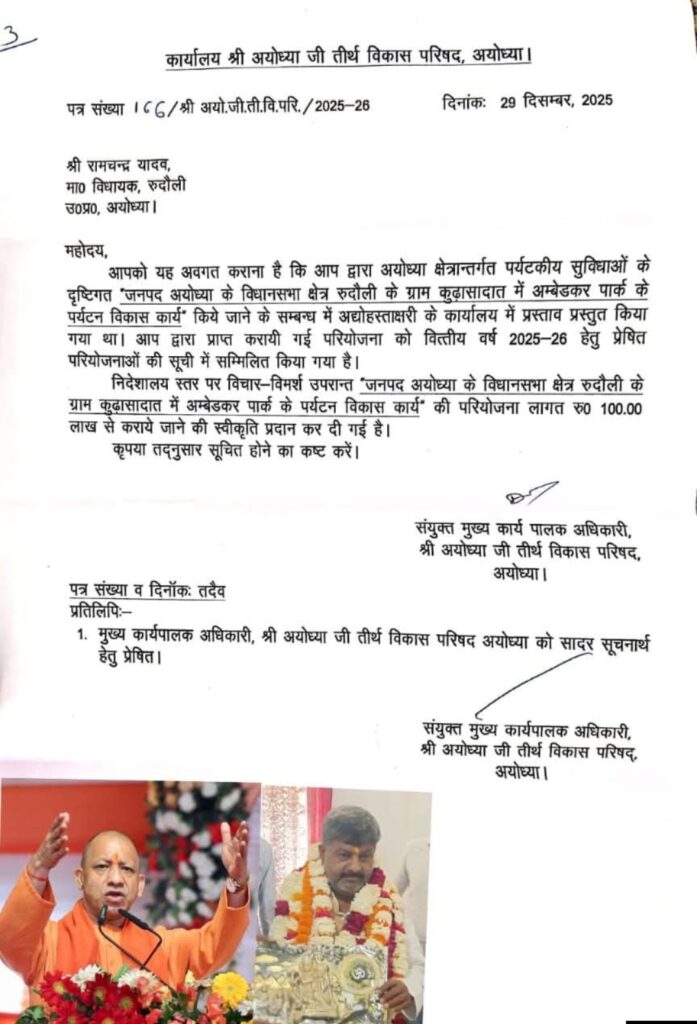 विधायक रामचन्द्र यादव द्वारा क्षेत्रवासियों की वर्षों पुरानी मांग को ध्यान में रखते हुए यह प्रस्ताव उत्तर प्रदेश सरकार के पर्यटन विभाग को भेजा गया था। अयोध्या क्षेत्र में पर्यटकीय सुविधाओं के विस्तार की दृष्टि से प्रस्ताव को वित्तीय वर्ष 2025–26 की परियोजना सूची में सम्मिलित करते हुए ₹100.00 लाख (एक करोड़ रुपये) की लागत से अम्बेडकर पार्क के विकास कार्य को स्वीकृति प्रदान की गई है।