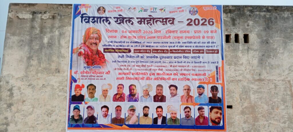 जनपद मथुरा के कस्बा बाजना के पास पारसौली गांव में तारीख 4/01/2026 दिन रविवार को विशाल खेल महोत्सव का आयोजन हो रहा है जिसके आयोजनकर्ता समस्त गांववासी हैं।बताया जा रहा है कि इस महोत्सव के मुख्य अतिथि योगेश नौहवार MLC सदस्य हैं।इस खेल महोत्सव में 1600m,800m,5km, लॉन्ग जंप आदि प्रतियोगिताओं का आयोजन हो रहा है। गांव वालों ने बताया कि इस महोत्सव का उद्देश्य खेल की भावनाओं को बढ़ाना है।