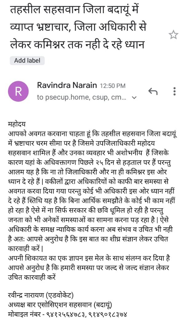जब जनता का रक्षक ही भक्षक बन जाए तब जनता की फरियाद को कौन सुनेगा। बार एसोसिएशन के अध्यक्ष रविंद्र नारायण सक्सेना ने मोबाइल फोन पर एडीशनल चीफ सेक्रेट्री अवनीश अवस्थी को अधिवक्ताओं की समस्याओं से अवगत कराते हुए तहसील में व्याप्त भ्रष्टाचार के संबंध में विस्तार पूर्वक बताया। जिस पर एडीशनल चीफ सेक्रेट्री अवनीश अवस्थी ने वार के अध्यक्ष रविंद्र नारायण सक्सेना से कहा कि आप अधिवक्ताओं की समस्याओं को मेरी मेल पर भेज दे। समस्याओं का शीघ्र समाधान कराया जाएगा।इसके बाद उन्होंने मुख्यमंत्री के विशेष सचिव से मोबाइल पर संपर्क किया तब उन्होंने भी कहां आप अधिवक्ताओं की समस्याओं को मेरी मेल पर अपलोड कर दें।इस मौके पर रुकुम सिंह यादव, कमल कुमार सक्सेना, राजीव चांडक, सतीश पाठक, रविंद्र पाठक, हरीश पाठक, शांति शरण शर्मा, रूमाली सिंह, हरेंद्र सिंह यादव, रविंद्र अग्निहोत्री, सय्यद जावेद इकबाल नकवी, राजपाल सिंह यादव, सोमवीर सिंह यादव, धर्मेंद्र यादव, सनी मिश्रा, आदि मौजूद रहे।