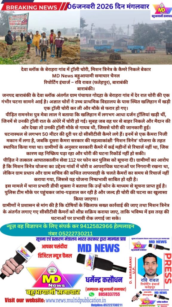 जनपद बाराबंकी के देवा ब्लॉक अंतर्गत ग्राम पंचायत गोदहा के बेराहरा गांव में देर रात चोरी की एक गंभीर घटना सामने आई है। अज्ञात चोरों ने उच्च प्राथमिक विद्यालय के पास स्थित खलिहान में खड़ी एक ट्रॉली चोरी कर ली और मौके से फरार हो गए।