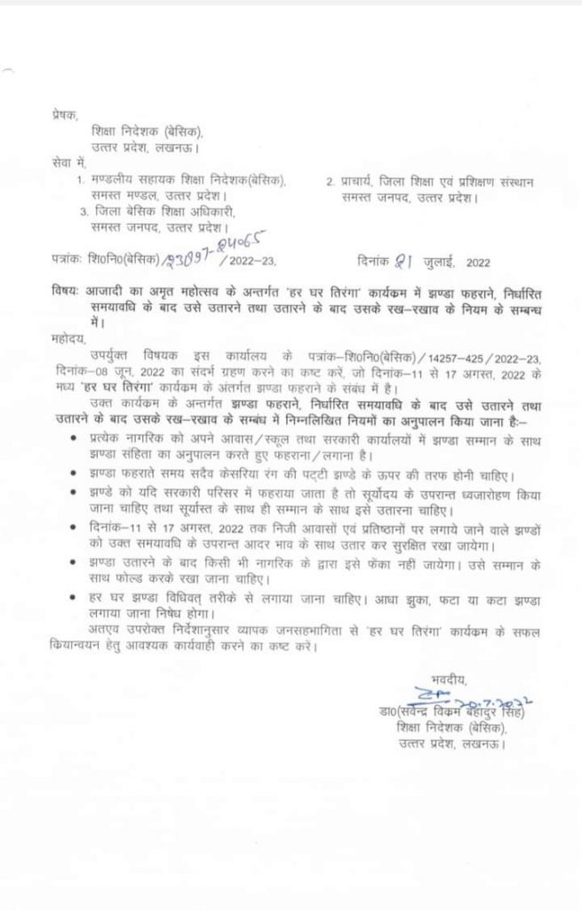 धर्मेन्द्र कसौधन(ब्यूरो):देश मे आजादी का अमृत महोत्सव के अंतर्गत हर घर तिरंगा कार्यक्रम के तहत 11 से 17 अगस्त के बीच रोज झण्डा फहराया जाएगा। वहीं सूर्यास्त के बाद इसे उतारा जाएगा। बेसिक शिक्षा निदेशक सर्वेन्द्र विक्रम बहादुर सिंह ने झण्डा फहराने और इसे उतारने के बाद रखरखाव से संबंधित नियम जारी शुक्रवार को कर दिए हैं।